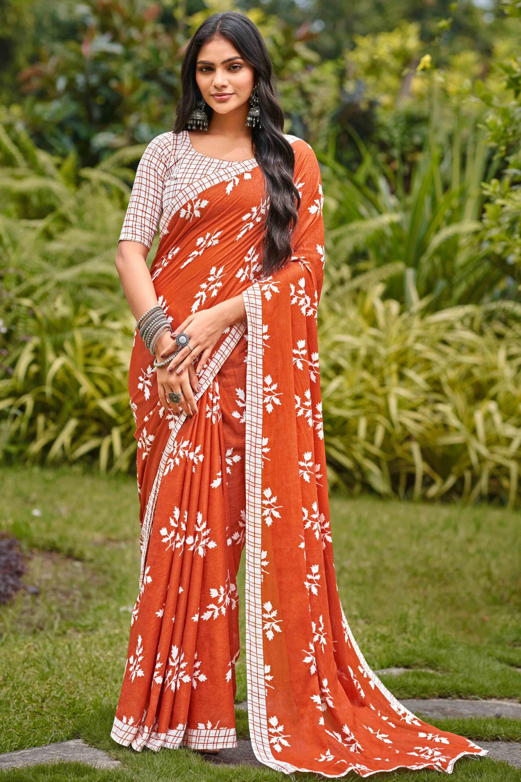 Rust Orange Pure Cotton Saree with Delicate Floral Patterns